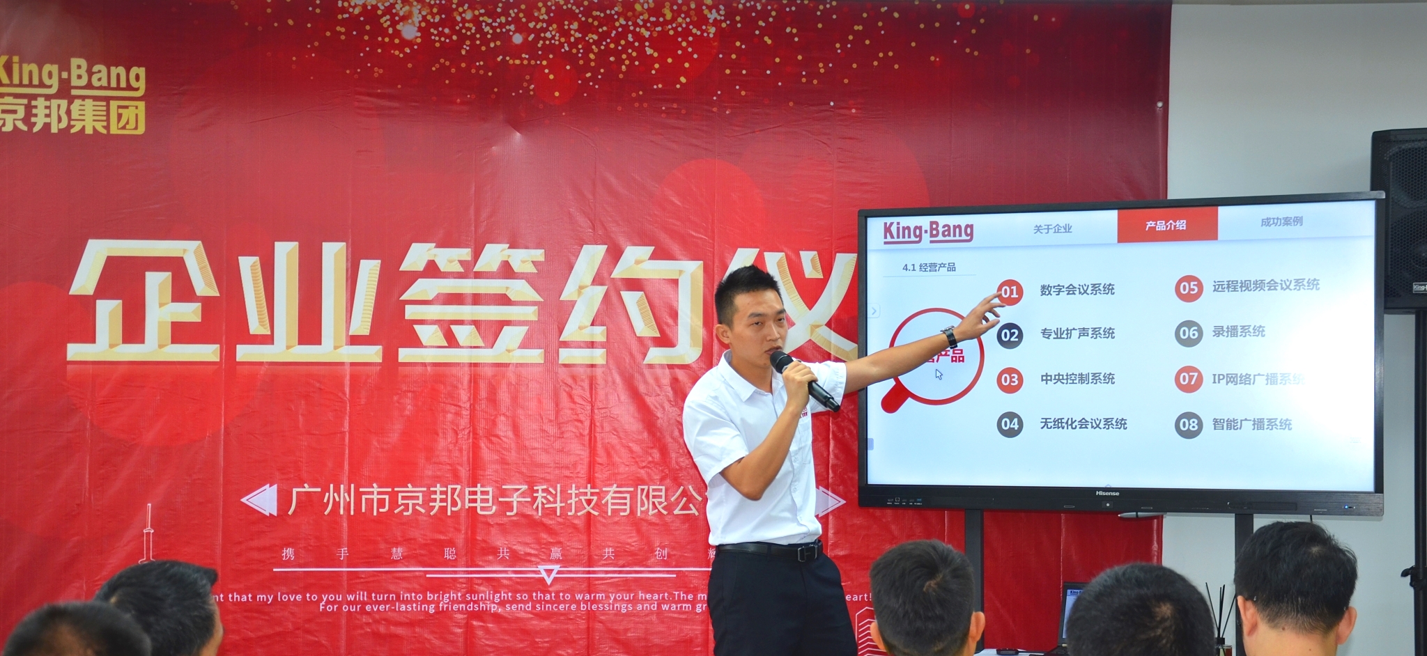 京邦電子(KING-BANG)本次活動(dòng)為慧聰網(wǎng)買家團(tuán)帶來了全新的會(huì)議系統(tǒng)、網(wǎng)絡(luò)廣播系統(tǒng)、智能交互式無(wú)紙化會(huì)議系統(tǒng)、分布式多媒體中控矩陣系統(tǒng)及專業(yè)擴(kuò)聲等多個(gè)系統(tǒng)應(yīng)用,以“為客戶創(chuàng)造價(jià)值,為客戶解決問題,至誠(chéng)服務(wù)客戶“出發(fā),為行業(yè)帶來領(lǐng)先的音視頻整體解決方案和服務(wù)模式。